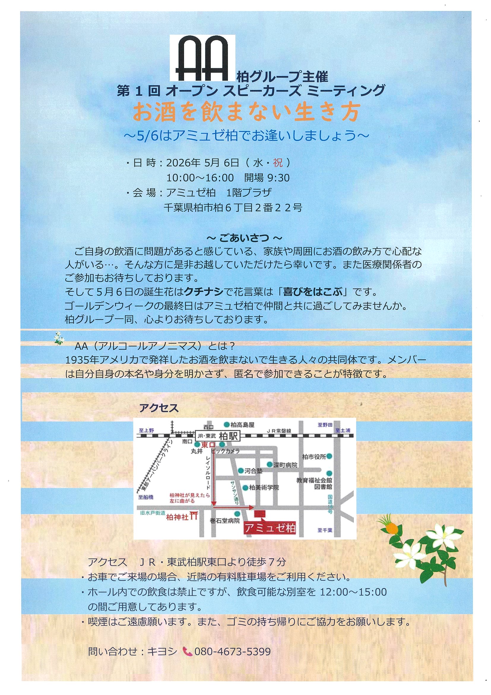 AA(アルコホーリクス・アノニマス)柏グループ オープンスピーカーズミーティング「お酒を飲まない生き方」~5/6はアミュゼでお逢いしましょう~